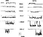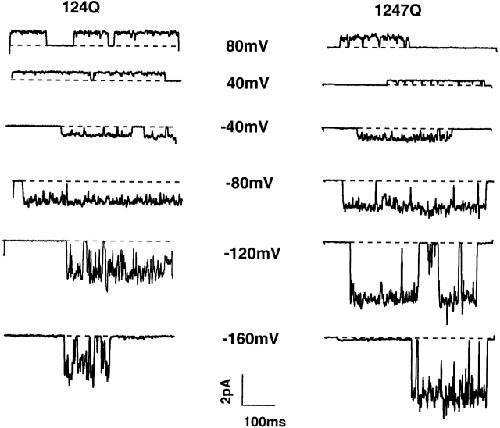 Figure 3. Typical single channel current traces for 124Q (left) and 1247Q (right) in symmetric 115 mM K+ solutions at various test potentials. Both mutant channels open across the voltage range from −160 to +80 mV. Holding potential was 0 mV for both mutants.
