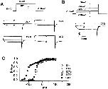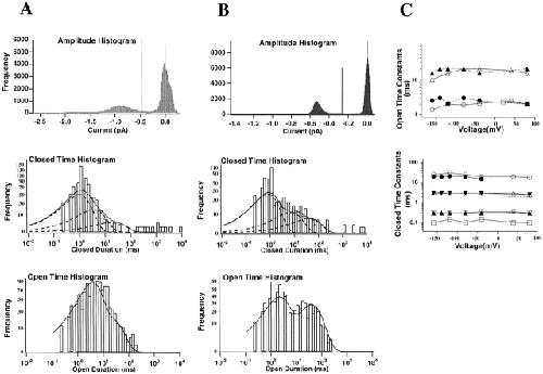 Figure 5. Analysis of single channel currents from the 1247Q mutant at −40-mV test potential in symmetric 115-mM K+ solutions (A), and in external 115-mM Rb+ solution (B). For each solution, single channel amplitude histograms are shown (top) together with logarithmic open time (bottom) and closed time distributions (center). Lines of fit were obtained using a maximum likelihood method. Dashed lines indicate individual exponential components. (C) Open time constants and the four closed time constants are plotted as functions of test potential, data from 124Q (open symbols), and from 1247Q (solid symbols). The mean open time for wild-type ShΔ is indicated as open square at the voltage of 20 mV. The three closed time constants for wild-type ShΔ are indicated as the dashed line. Data in A and B were from two representative patches. Data in C are means.