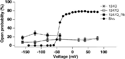 Figure 4. Po(V) relationships for the 124Q and 1247Q mutants, compared with wild-type ShΔ channels. The wild-type ShΔ data were derived from Fig. 1 A control ShΔ data, scaled to the observed Po,max at +80 mV for ShΔ channels. Single channel data were recorded in inside-out configuration and symmetric (115 mM) K+ solutions or Rb+ (115 mM)//K+ (115 mM) solutions as indicated. All data points are means ± SD, n = 3–6 patches.