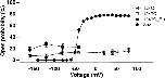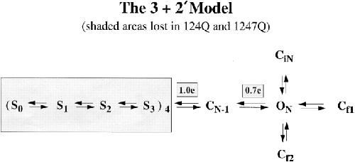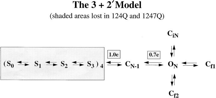 Figure 7. The 3+2′ model redrawn from Schoppa and Sigworth (1998c). Estimated reaction valences from their model fits to wild-type ShΔ channel data are shown above each voltage-sensitive reaction step. Shaded areas are presumed to be dysfunctional in voltage-insensitive 124Q and 1247Q mutant channels.