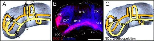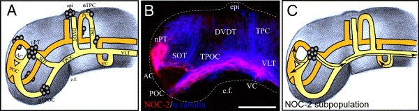 Fig. 1. The scaffold of axon tracts in the embryonic Xenopus forebrain. (A) The major axon tracts and nuclei of the Xenopus forebrain at 40 h post-fertilization are represented schematically to show the bilateral symmetry of the axon scaffold. The rostral end of the neural tube is curved about the cephalic flexure (c.f.). The dorsal surface of the diencephalon contains the epiphysis (epi). For abbreviations, see below. (B) Double-immunolabeling of control Xenopus forebrains for the NOC-2+ subpopulation of axons (red) and acetylated α-tubulin to show all axons (blue). Axons expressing both NOC-2 and acetylated α-tubulin appear pink. (C) Schematic representation of the trajectory of the NOC-2+ subpopulation of axons in one half of the Xenopus forebrain (arrows). This trajectory is bilaterally symmetrical. The axons in each brain hemisphere arise in the nPT and course within the AC, POC, SOT, ventral TPOC, VLT and VC. Scale bar = 60 μm. AC, anterior commissure; POC, post-optic commissure; nPT, nucleus of the presumptive telencephalon; nTPOC, nucleus of the tract of the post-optic commissure; SOT, supraoptic tract; TPOC, tract of the post-optic commissure; DVDT, dorsoventral diencephalic tract; epi, epiphysis; nTPC, nucleus of the tract of the posterior commissure, PC, posterior commissure; TPC, tract of the posterior commissure; VC, ventral commissure; VLT, ventral longitudinal tract.