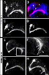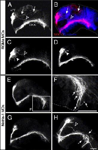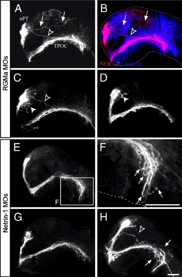 Fig. 6. Knock down of either RGMa or Netrin-1 phenocopies the SOT defect arising from knock down of Neogenin in vivo. All panels show lateral views of dissected brains from stage 32 embryos, dorsal to the top, rostral to the left, immunolabeled for the NOC-2+ subpopulation of axons unless otherwise indicated. Embryos were co-injected with EGFP mRNA and MOs against RGMa (A�D) or Netrin-1 (E�H). (A, C�D) Three examples of abnormal phenotypes observed after RGMa knock down. The SOT is reduced (A, C) or fails to completely project between the nPT and the TPOC (C�D, arrowhead). The unfilled arrowheads show single axons that have navigated the SOT. Axons from the nPT project aberrantly in the dorsal forebrain (A, arrows). (B) The same brain as in panel A, double-labeled for NOC-2 (red) and acetylated α-tubulin (blue) shows that the axon scaffold is grossly normal. The dashed line indicates the margins of the brain. (E, G�H) Three examples of abnormal phenotypes observed after knock down of Netrin-1. The SOT is reduced (H, unfilled arrowhead) or fails to form (E, G). There are also defects in the formation of the ventral commissure (F, H, arrows). (F) Magnification of the boxed area in panel E showing VC defects. Several axons appear to loop back towards the ipsilateral TPOC (arrows) and fail to cross the midline. The dashed line in panel F indicates the ventral margin of the brain. For control phenotype, see Fig. 4A. Scale bar = 30 μm; scale bar in panel H applies to panels A�E, G�H.