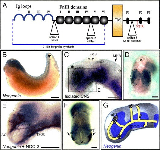 Fig. 2. Neogenin mRNA is expressed in the developing Xenopus forebrain. (A) The predicted structure of Xenopus Neogenin is shown schematically. Xenopus Neogenin contains an open reading frame of 4326 bp and encodes a protein of 1442 amino acids. It has four immunoglobulin-like (Ig) domains, six fibronectin type III (FnIII) domains, a transmembrane region (TM) and a cytoplasmic tail containing three highly conserved domains (P1�P3). The positions of three alternatively spliced exons are indicated (splice 1, bp 1273�1332; splice 2, bp 2534�2581; splice 3, bp 3653�3680). The inclusion of splice 3 (28 bp) imparts a frameshift and premature stop codon, resulting in a truncated protein. Xenopus Neogenin possesses an SQTG amino acid motif in its cytoplasmic tail, instead of the usual conserved C(C/T)TD motif for caspase-3 cleavage, suggesting that Neogenin is unlikely to be involved in caspase-3-mediated cell death in Xenopus. The region used for synthesis of antisense probe is identified. (B) Lateral view of Neogenin mRNA expression on a whole-mount stage 30�31 Xenopus embryo, dorsal to the top and rostral to the left. Neogenin expression is predominant in the head (asterisk) and spinal cord (arrowhead) and is also present in the gut and somites. (C) Lateral view of Neogenin mRNA expression in isolated CNS tissue from a stage 30�31 Xenopus embryo. The forebrain (fb), midbrain (mb), hindbrain (hb), forebrain�midbrain boundary (FMB) and midbrain�hindbrain boundary (MHB) are indicated. Neogenin expression (indicated by the dashed line) is strong in the dorsal forebrain and extends into the ventral midbrain. Expression is also strong in the ventral hindbrain. Neogenin is absent from the hypothalamus (h), epiphysis (e), dorsal midbrain, midbrain�hindbrain boundary and dorsal hindbrain. (D) Dorsorostral view of an isolated stage 30�31 Xenopus brain, dorsal to the top (indicated by the epiphysis (e)), showing strong expression of Neogenin extending from both sides of the midline to the lateral margins of the dorsal forebrain. The estimated position of the nPT relative to these zones of Neogenin expression is indicated (hatched circles), based on double-labeling experiments (see panel F). (E�F) Isolated CNS from stage 30�31 Xenopus embryos, double-labeled for Neogenin mRNA expression (blue) and the NOC-2+ subpopulation of forebrain axons (brown), revealing their spatial relationship. (E) Magnification of a region of the forebrain in lateral view, equivalent to that indicated by a box in panel C, double-labeled for Neogenin (blue) and NOC-2 (brown stain, which appears deep purple in this double label). Neogenin is expressed in the nucleus of the presumptive telencephalon (nPT, indicated by the dashed circle) and in the neuroepithelium underlying the supraoptic tract (SOT) and the longitudinally oriented tract of the post-optic commissure (TPOC). The anterior commissure (AC) is indicated. (F) Dorsorostral view of a double-labeled brain, showing that Neogenin is expressed by the nPT (arrows). The AC is indicated at the rostral margin of the forebrain, and the epiphysis (e) is indicated at the dorsal surface of the brain. (G) Schematic representation of Neogenin mRNA expression in relation to the axon scaffold in the Xenopus forebrain. Scale bar in panel B = 500 μm, panels C�F = 60 μm.
