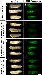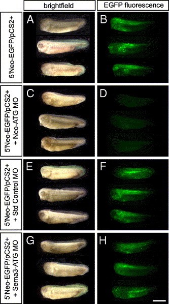 Fig. 3. Morpholino controls demonstrate efficacy of targeted knock down approach. Bright-field and fluorescent image analysis of stage 30-32 Xenopus embryos co-injected with plasmids encoding EGFP reporter constructs and morpholinos. Rostral is to the left and dorsal to the top in all panels. (A-B) Embryos injected with 5â²Neo-EGFP/pCS2+ alone (230 ng) displayed strong mosaic expression of EGFP at stage 32 (40 hpf). (C-D) Embryos co-injected with an equivalent amount of 5â²Neo-EGFP/pCS2+ and Neo-ATG MO (11.5 ng) failed to express EGFP. Embryos co-injected with the EGFP reporter plasmid and Neo-UTR MO had the same appearance. (E-F) Embryos co-injected with 5â²Neo-EGFP/pCS2+ and a control nonsense MO (Std Control MO, 11.5 ng) showed strong mosaic EGFP expression. (G-H) Co-injection of 5â²Neo-EGFP/pCS2+ with a morpholino targeted to an unrelated gene in Xenopus (Semaphorin3; Sema3-ATG MO, 11.5 ng) also produced embryos with strong mosaic expression of EGFP. Scale bar = 1 mm.