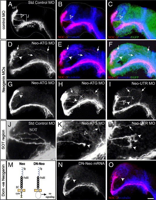 Fig. 4. Knock down of Neogenin or expression of dominant-negative Neogenin causes axon pathfinding errors. Embryos were co-injected with the Std Control MO and EGFP mRNA (A�C, J), Neogenin MOs and EGFP mRNA (D�I), (K�L) or dominant-negative Neogenin mRNA and EGFP mRNA (N�O). All are lateral views of dissected brains from stage 32 embryos, immunolabeled for the NOC-2+ subpopulation of axons unless otherwise indicated. Dorsal is to the top and rostral is to the left in all panels. (A�C) Injection of the Std Control MO does not affect the trajectory of the NOC-2+ subpopulation of axons. (A) The SOT appears normal (unfilled arrowhead), coursing ventrocaudally from the nPT in the dorsal forebrain to the ventral TPOC. The boxed region is magnified in panel J. (B) Double-labeling for NOC-2 (red) and acetylated α-tubulin (blue) for all axons reveals normal forebrain morphology (compare to Fig. 1B). The dashed line in panels A and B indicates the margins of the dissected brain. (C) Injected cells were traced by EGFP fluorescence (green). (D�I) Four examples of abnormal phenotypes observed after Neogenin knock down using Neo-ATG or Neo-UTR MOs, as indicated. The SOT is reduced in size or fails to form properly (arrowheads in panels D�I, boxed regions in panels H�I are magnified in panels K�L, respectively) and nPT axons are observed to follow aberrant trajectories in the dorsal forebrain (arrows in panels D�F, H�I, K�L). (E�F) The same brain as in panel D, double- or triple-labeled as in panels B and C, to show that the axon scaffold in Neogenin MO-injected animals is grossly normal. (J�L) Magnification of the boxed areas in panels A, D and I, respectively, to show the SOT phenotype in control (J) and Neogenin knock down animals (K�L). Loss of Neogenin either prevented some nPT axons from growing ventrally within the SOT (arrowheads in panels K�L, unfilled arrowhead in panel K shows a reduced SOT comprised of a single axon) or caused them to grow along abnormal longitudinal trajectories in the dorsal forebrain (arrows in panels K�L). (M) Schematic representation of the Neogenin truncation construct (DN-Neo) which lacked the cytoplasmic signaling domain. Embryos were injected with mRNA transcripts encoding DN-Neo and EGFP (N�O). Overexpression of DN-Neo caused defects in SOT formation, similar to that described for the Neogenin MO knock down animals. The SOT often failed to develop (arrowhead in panels N�O, compare to panel G). Co-labeling for acetylated α-tubulin (blue in panel O) showed that axon scaffold development was grossly normal in these animals. Scale bar = 30 μm. Scale bar in panel O applies in panels A�I, N; scale bar in panel L applies in panels J�K.