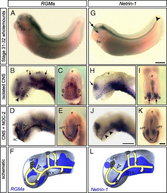 Fig. 5. The Neogenin ligands RGMa and Netrin-1 are expressed in the developing Xenopus forebrain. In situ hybridization for RGMa (A�E) and Netrin-1 (G�K) was performed on whole-mount stage 30�31 embryos (A, G) and isolated stage 30�31 brains, indicated by dashed lines (B�C, H�I). All staining is bilaterally symmetrical. Combined in situ staining (blue) with immunostaining for the NOC-2+ subset of forebrain axons (brown) was performed to show the relationship between axon tract formation and mRNA expression (D�E, J�K). (A) In lateral view of a whole-mount Xenopus embryo, RGMa expression is detected in the brain, spinal cord somites and branchial arches (ba). (B) In lateral view of an isolated brain, strong RGMa expression is detected in the forebrain (fb), midbrain (mb) and hindbrain (hb). Expression extends rostrally in a band from the dorsal telencephalon, terminating in a ventral �wedge� (asterisk) at the rostral end of the forebrain. RGMa expression is absent from the trajectory of the TPOC (arrowhead) but a patch of expression is detected in the ventral forebrain, dorsal to the hypothalamus (h). RGMa is expressed throughout the ventral half of the midbrain and hindbrain, extending in dorsal peaks at the forebrain�midbrain boundary and midbrain�hindbrain boundary (arrows). (C) In dorsorostral view (epiphysis (e) indicates the dorsal surface of the brain), RGMa expression in the forebrain is detected along the midline and in the neuroepithelium medial to the estimated position of the nPT (hatched circles, compare to double-labeled image in panel E). The rostroventral wedge of RGMa expression in the forebrain (asterisks) extends laterally. Lateral (D) and dorsorostral views (E) of brains double-labeled for NOC-2 shows that RGMa expression is absent from the pathway underlying the nPT, AC and TPOC. The SOT forms along the border of the rostroventral �wedge� of RGMa expression, then grows into a region in devoid of RGMa (unfilled arrowhead in panel D). (G) In lateral view of a whole-mount Xenopus embryo, Netrin-1 is detected in a distinct patch in the brain (arrow) and throughout the ventral CNS (arrowhead). Expression is also detected in the ventral retina and the branchial arches (ba). (H) Netrin-1 expression is strong throughout the ventral forebrain, midbrain and hindbrain. A distinct patch of expression is also present in the dorsal forebrain (arrow). (I) A dorsorostral view shows that Netrin-1 expression in the dorsal forebrain (arrows) is located medially, close to the midline. The estimated positions of the nPT are indicated (hatched circles, compare to double-labeled image in panel K). The epiphysis (e) denotes the dorsal surface of the brain. (I) Double-labeling in lateral (J) and dorsorostral view (K) shows that Netrin-1 expression lies medial to the nPT, and underlies the TPOC (arrowheads). (F, L) Schematic representations of the expression of RGMa and Netrin-1 relative to the axon scaffold is consistent with their potential interaction with Neogenin as ligand-receptor pairs in the guidance of nPT axons to form the SOT (unfilled arrowhead). Scale bar in panel G = 500 μm and also applies to panel A, scale bar in panel J = 60 μm and applies to panels B, D, H, scale bar in panel K = 60 μm and applies to panels C, E, I.