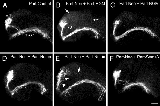 Fig. 7. Simultaneous partial knock down of Neogenin with either RGMa or Netrin-1 shows genetic interaction in vivo. All panels show lateral views of dissected brains from stage 32 embryos, dorsal to the top, rostral to the left, immunolabeled for the NOC-2+ subpopulation of axons. (A) Animal injected with a reduced dose of Neo-ATG MO (Part-Control), showing normal axon pathways. Embryos injected with a reduced dose of either RGM-ATG MO or Netrin-ATG MO had the same appearance. (B, C) Two examples of abnormal phenotypes seen in animals injected with a combination of MOs to elicit partial knock down of both Neogenin and RGMa. The SOT is reduced (B, unfilled arrowhead) or fails to form (C) and there are abnormal caudoventrally directed nPT axons in the dorsal forebrain (B, arrows). (D, E) Two examples of abnormal phenotypes seen in animals injected with a combination of MOs to elicit simultaneous partial knock downs of Neogenin and Netrin-1. The SOT is reduced or fails to form correctly (D, filled arrowheads in panel E), and there are abnormal caudoventrally directed nPT axons in the dorsal forebrain (arrow in panel E). (F) Animal injected with a combination of MOs to elicit simultaneous partial knock down of Neogenin and an unrelated ligand, Semaphorin3, showing normal axon pathways (compare the phenotype to panel A). Scale bar = 30 μm.