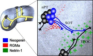 Fig. 8. Proposed model for axon guidance in the supraoptic tract, mediated by interactions between Neogenin, RGMa and Netrin-1. The Neogenin receptor is expressed by a subset of neurons in the nPT (blue). Axons exiting the nPT are funneled into the SOT via a wedge of the chemorepulsive ligand RGMa (red −), expressed in a stripe of neuroepithelium lying ventral and rostral to the tract. Axons are also simultaneously attracted ventrally by a chemoattractive gradient of Netrin-1 expression underlying the TPOC (green +). When Neogenin, RGMa or Netrin-1 are knocked down, the SOT fails to form correctly and nPT axons follow abnormal trajectories.