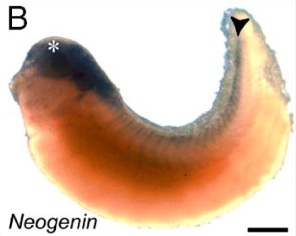 neo1 (neogenin 1)gene expression in Xenopus laevis Borealis embryos, NF stage 32, as assayed by in situ hybridization. Lateral view: anterior left, dorsal up.