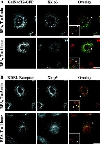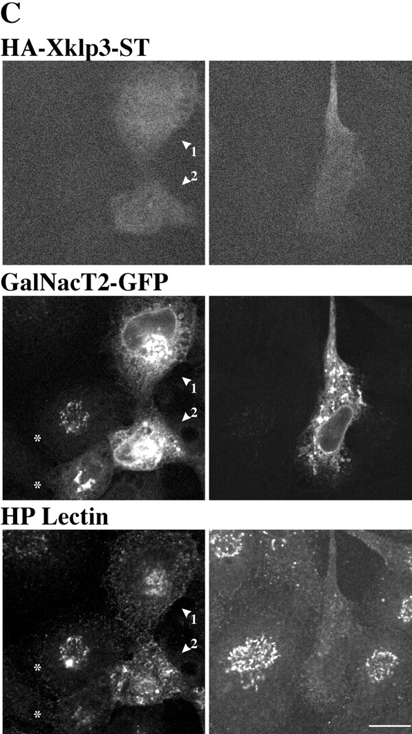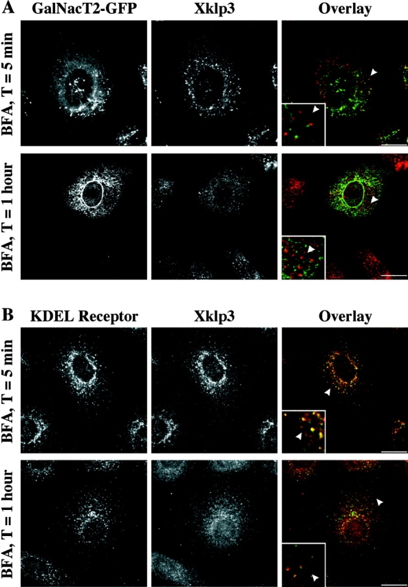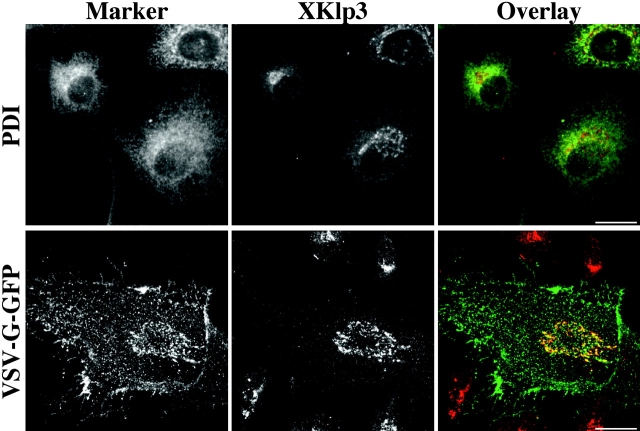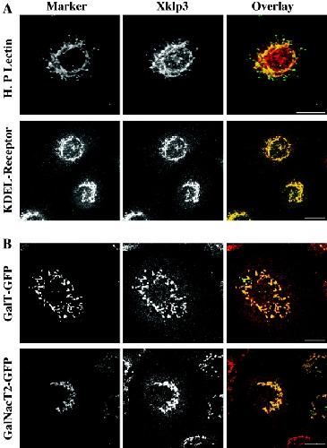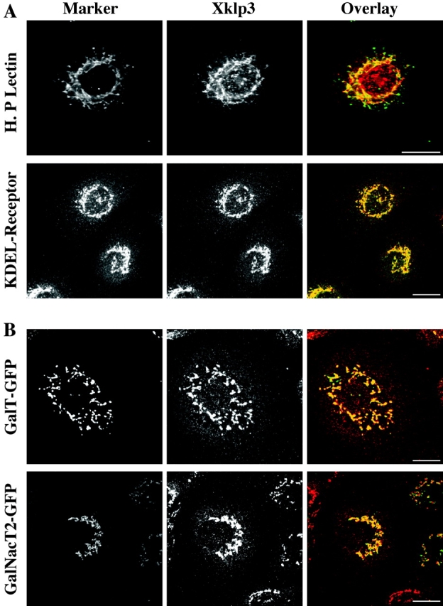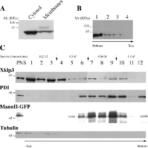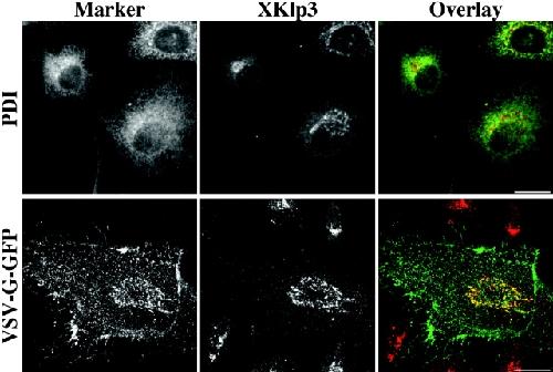 The function of the Golgi apparatus is to modify proteins and lipids synthesized in the ER and sort them to their final destination. The steady-state size and function of the Golgi apparatus is maintained through the recycling of some components back to the ER. Several lines of evidence indicate that the spatial segregation between the ER and the Golgi apparatus as well as trafficking between these two compartments require both microtubules and motors. We have cloned and characterized a new Xenopus kinesin like protein, Xklp3, a subunit of the heterotrimeric Kinesin II. By immunofluorescence it is found in the Golgi region. A more detailed analysis by EM shows that it is associated with a subset of membranes that contain the KDEL receptor and are localized between the ER and Golgi apparatus. An association of Xklp3 with the recycling compartment is further supported by a biochemical analysis and the behavior of Xklp3 in BFA-treated cells. The function of Xklp3 was analyzed by transfecting cells with a dominant-negative form lacking the motor domain. In these cells, the normal delivery of newly synthesized proteins to the Golgi apparatus is blocked. Taken together, these results indicate that Xklp3 is involved in the transport of tubular-vesicular elements between the ER and the Golgi apparatus.