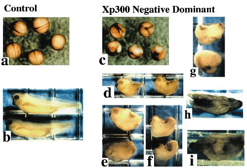 Fig. 7. Microinjection of the truncated DNA fragment of Xenopus p300/CBP into Xenopus embryos. (a, b) Control injection sample