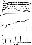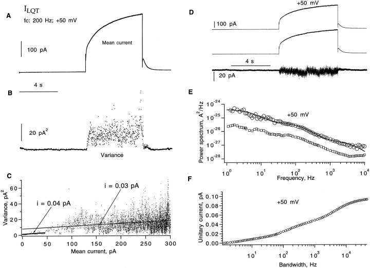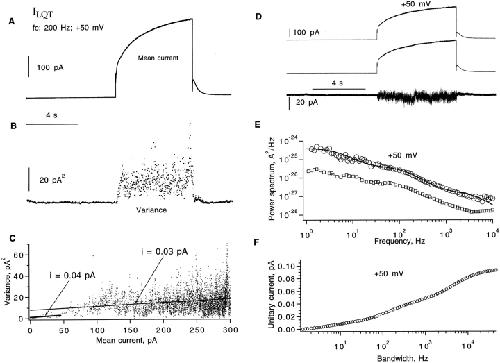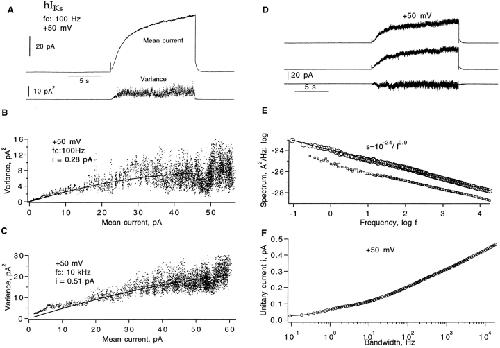 Figure 5. Fluctuation analysis of ILQT. (A) Ensemble mean current was calculated from pairs of sweeps from a total of 10 sweeps, obtained in a giant cell-attached patch recording from an oocyte injected with KvLQT1 RNA alone. Currents were induced by depolarizing pulses to +50 mV from a −80-mV holding potential and repolarized to −60 mV. Data were filtered at 200 Hz. (B) Time course of variance. (C) Variance–mean plot. A linear fit for the current range <50 pA yields unitary current iv = 0.04 pA; iv = 0.03 pA from a linear fit to the entire current range. (D) A pair of aligned current traces and the subtracted current trace filtered at 1 kHz. Same data as in A. (E) Power spectrum calculated from subtracted currents after background noise subtraction. Solid curve is the sum of three Lorentzians with corner frequencies 5, 141, and 5,000 Hz and amplitudes 3.6 · 10−25, 3.7 · 10−26 and 1.6 · 10−27 A2/Hz, respectively. The corresponding mean current was 240 pA, and the estimated single-channel current is = 0.09 pA at 20 kHz. The bottom trace is the spectrum from another recording, displaced downward by one decade for clarity. The mean current in this case was 370 pA and is(20 kHz) = 0.08 pA. (F) Unitary current is was calculated from the integral of the power spectrum; points beyond 10 kHz were computed from the fitted function. In the patch recording, the bath solution was 93 mM K-aspartate, 7 mM KCl, 1 mM EGTA, 10 HEPES, pH 7.4; the pipette solution contained 100 mM NaCl, 1 mM MgCl2, 0.1 mM CaCl2, 5 mM HEPES.