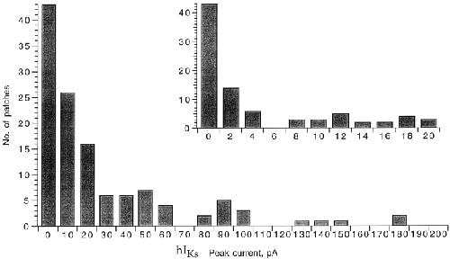 Figure 3. Frequency distribution of hIKs patch currents. Current was measured at the end of a 5-s depolarization to +50 mV in each of 128 patches, and histograms were constructed. The inset shows an expanded histogram, where the bin at zero represents the 43 patches that showed no IKs current.
