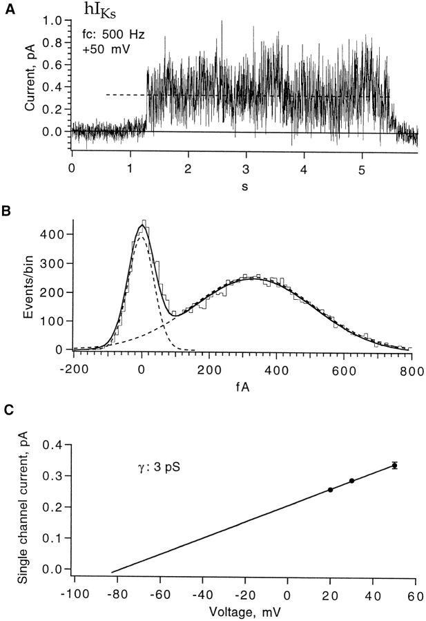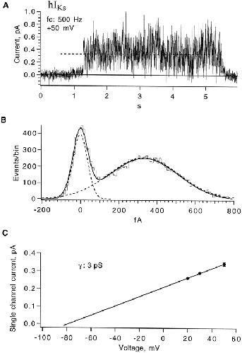 Figure 4. Single-channel hIKs current. (A) One sweep showing a putative hIKs single-channel opening, recorded from a three-channel patch at +50 mV. Data were filtered at 500 Hz. (B) All-points amplitude histogram, which yields an apparent unitary current 0.34 pA (indicated by the dashed line in A). (C) Single channel currents estimated from amplitude histograms at 200 Hz bandwidth (n = 4 for +50 mV, n = 1 for other voltages). A linear fit yields 3 pS for the single-channel conductance.