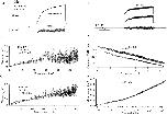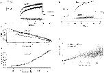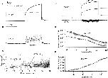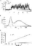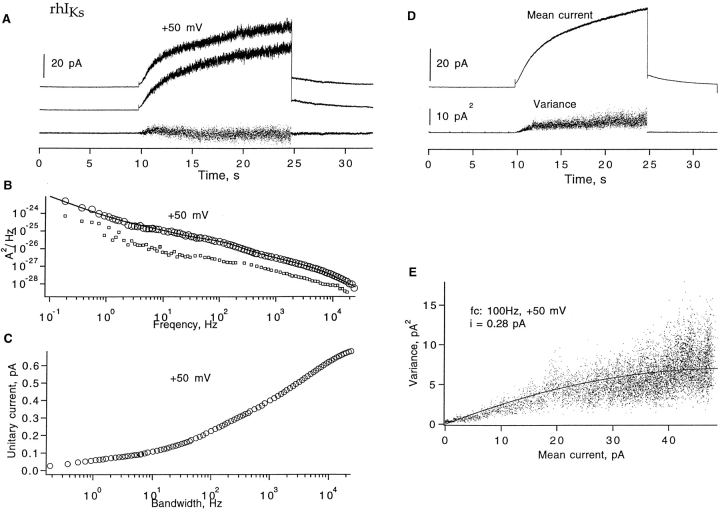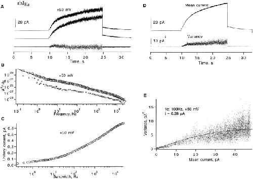 Figure 6. Fluctuation analysis of rhIKs currents. (A) A pair of successive current traces, filtered at 1 kHz. The current was induced by +50-mV depolarizing pulses from −80-mV holding potential, and repolarized to –60 mV in a cell-attached patch recording with 140 mM K-aspartate, 1 mM EGTA, 10 mM HEPES, pH 7.4 in the bath; 96 mM NaCl, 2 mM KCl, 1 mM MgCl2, 0.1 mM CaCl2, 5 mM HEPES in the pipette. Pulses were delivered every 33 s; mean current during the depolarizing pulse was 34 pA. (B) The corrected power spectrum of currents, computed from 36 traces. The solid curve is a fitted power-law function plus four Lorentzian components, of the form S = 1.1 · 10−29 + 6.1 · 10−25/f 1.2 + 6 · 10−26/[1 + (f/11)2] + 2.9 · 10−27/[1 + (f/141)2] + 2.2 · 10−27/[1 + (f/1,195)2] + 8.8 · 10−28/[1 + (f/3,535)2], where f is in Hz and S is in A2/Hz. The unitary current is = 0.67 pA at 20 kHz bandwidth. The lower trace is the spectrum from another recording in which the mean current was 7 pA and is = 0.51 pA at 20 kHz. (C) Frequency dependence of unitary current calculated from the numeric integral of power spectrum over the frequency range 0.1 Hz–20 kHz. (D) Ensemble mean current and variance, from the same data filtered at 100 Hz. The variance trace was calculated from pairs of sweeps to minimize error due to drift. (E) Mean–variance plot. Superimposed is a parabolic fit, which yields the unitary current estimate iv = 0.28 pA.