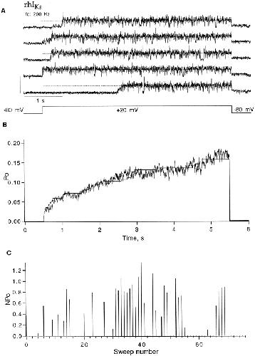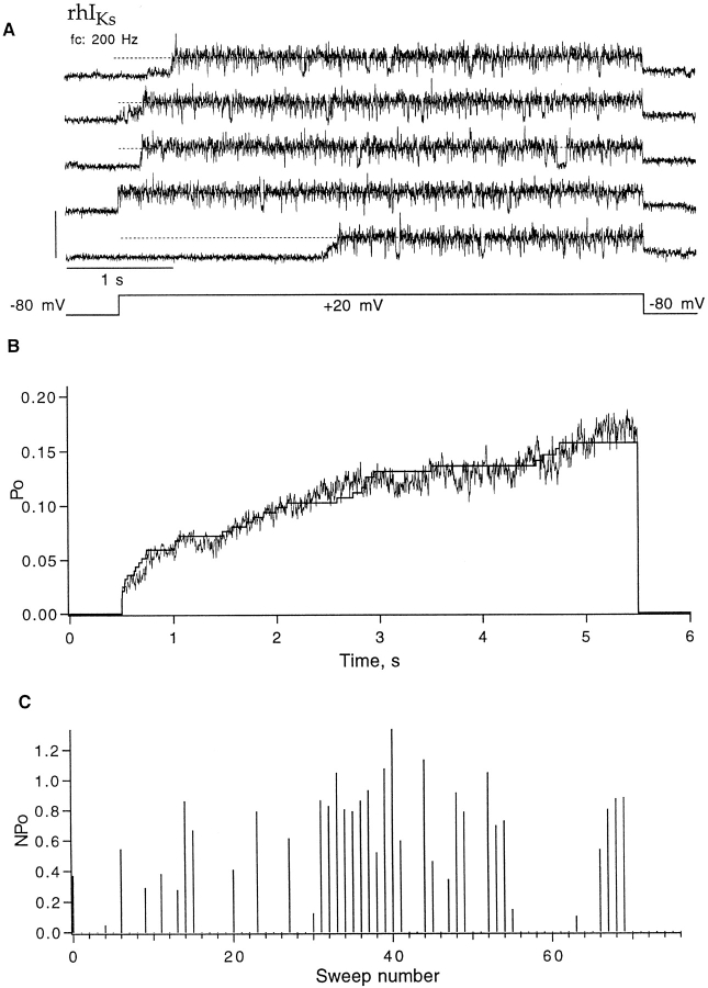 Figure 8. Behavior of rhIKs channels at 20 mV; same three-channel patch as in Fig. 7. (A) Five successive sweeps showing activity from only one channel. (B) The ensemble mean time course obtained from 77 sweeps (noisy trace) shows an instantaneous onset followed by a slow activation phase. The maximum open probability was 0.17. Superimposed is the corrected one-channel first latency F1 scaled by 0.8. (C) Diary plot of nPo. Currents were elicited by depolarizations to +20 mV, 5-s duration, delivered at 8-s intervals from a holding potential of −80 mV. Of a total 77 sweeps, 37 showed some activity; 11 of those showed a second channel opening during depolarization, and one sweep showed three channels open simultaneously.