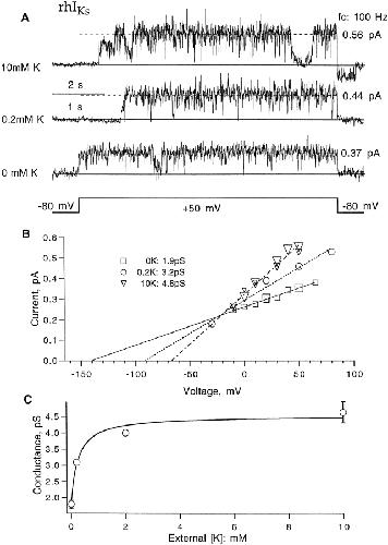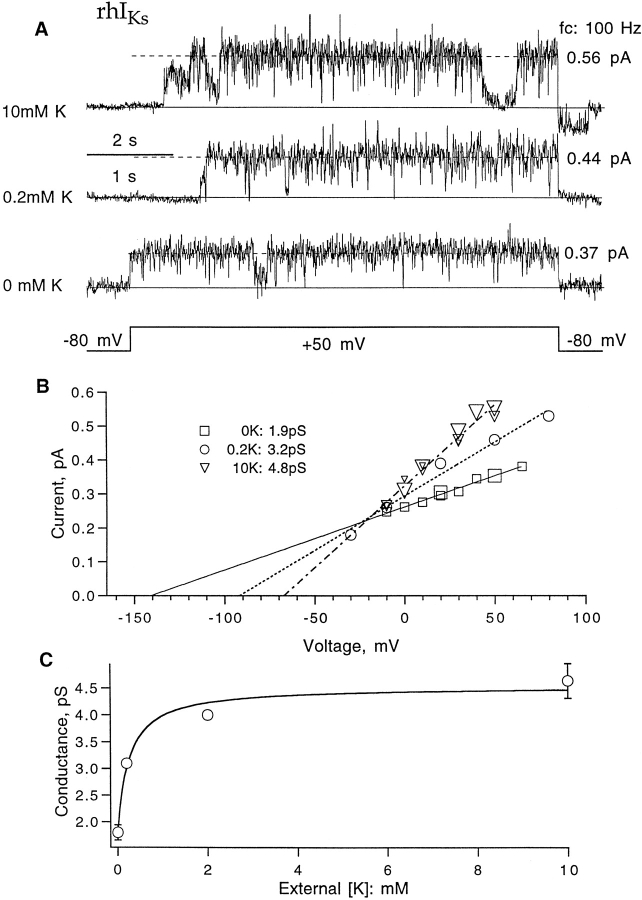 Figure 10. Single-channel conductance of rIKs channels with different external K+ solutions. (A) Representative current traces induced by +50-mV depolarizing pulses from −80-mV holding potential. Data were filtered at 100 Hz. (B) Single-channel current as a function of voltage obtained from double-Gaussian fits to amplitude histograms of traces. Fitted lines have slopes of 1.9, 3.2, and 4.8 pS for 0, 0.2, and 10 mM external K+, respectively. (C) External potassium dependence of single channel conductance. Error bars represent SEM (n = 2 for 0 mM and n = 4 for 10 mM; the points at 0.2 and 2 mM K+ are single observations). The superimposed fit is the function γ = 1.8 + 2.8/(1 + 0.5 mM/[K]) pS.