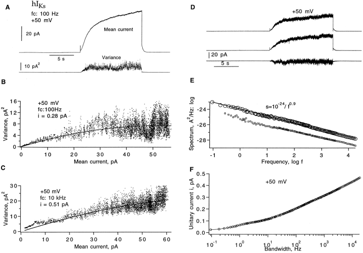 Figure 2. Fluctuation analysis of hIKs currents. (A) Mean current and time-dependent variance computed from 30 sweeps filtered at 100 Hz. The current was induced by +50-mV depolarizing pulses from a −80 mV holding potential in a cell-attached patch recording. Pulses were delivered every 32 s. (B) Mean–variance plot of 100 Hz–filtered currents. A fit of Eq. 1 yields unitary current iv = 0.28 pA and number of channels (n) = 368; the corresponding apparent open probability Pmax = 0.43. (C) Mean–variance plot from a total of 20 sweeps at 10 kHz bandwidth from the same patch. In this case, 12-s depolarizations to +50 mV were delivered every 32 s. The fit yields iv = 0.51 and Pmax = 0.24. (D) A pair of successive current traces and their difference filtered at 1 kHz; same set of data as in A. (E) The top trace is the resulting power spectrum of currents from 30 sweeps after correction for background noise. The contribution Sshot from ion transport during channels opening was estimated according to Sshot = 2e0I = 1.4 · 10−29 A2/Hz and was subtracted. The solid line indicates a power-law fit S(f) = 10−24/f 0.9 A2/Hz. The mean current was 45 pA, and the unitary current estimate is = 0.47 pA at 20 kHz bandwidth. The lower trace shows the spectrum (values plotted one decade lower in the graph for clarity) computed from another representative data set, where the mean current was 39 pA; the unitary current is = 0.44 pA at 20 kHz. (F) Dependence of apparent unitary current is (Eq. 3) on filter cut-off frequency at +50 mV. Variance was calculated from the numeric integral of the power spectrum over the frequency range 0.1 Hz–10 kHz.