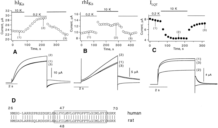 Figure 9. Effect of extracellular potassium on peak current of hIKs, rhIKs, and ILQT in the two-electrode voltage clamp. (A) Magnitude of hIKs current at the end of 5-s depolarizations to +30 mV as the bath solution was switched between 0.2 and 10 mM K+. The lower panel shows current traces corresponding to the times indicated at top. (B) rhIKs current; (C) ILQT current; (D) the amino acid sequences of human and rat minK in the vicinity of the putative transmembrane region (box).