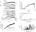 Figure 7. A three-channel, inside-out patch recording from rhIKs channels. (A) A trace with three channels opening during +50-mV depolarization. (B) Eight successive sweeps from the same patch, showing long first latencies in response to depolarizations to +50 mV from the −80-mV holding potential. Pulses were delivered every 8 s. Data were filtered at 200 Hz. (C) Comparison of the time course of the rhIKs macroscopic current seen in another patch (noisy trace) and the first latency function at +50 mV. (D) The ensemble mean time courses of open probability at 50 mV obtained from 60 sweeps. The open probability at the end of the 5-s depolarization was ∼0.5. The superimposed step-wise curve is the first-latency distribution F1 scaled by the factor 0.8. It was computed according to where F3 is the observed first-latency distribution from 60 sweeps recorded from the three-channel patch. (E) Diary plot of the three-channel first latency F3 in the patch recording. Latency values of 5 s correspond to the case in which no channel opens. (F) Diary plot of the time-averaged open probability from this patch. For this recording, the bath solution was 130 mM K-aspartate, 10 mM KCl, 1 mM EGTA, 10 mM HEPES, pH 7.4; the pipette solution was 100 mM NaCl, 0.2 mM KCl, 1 mM MgCl2, 1.8 mM CaCl2, 5 mM HEPES, pH 7.4.
