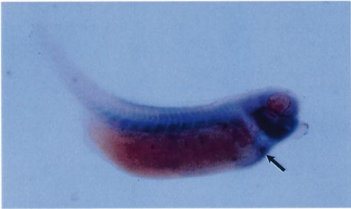 cebpb (CCAAT/enhancer binding protein beta) gene expression in Xenopus laevis embryo, assayed via in situ hybridization, NF stage 38, lateral view, anteriorright, dorsal up.