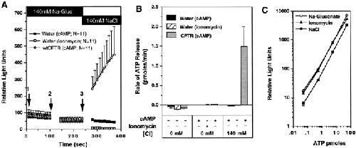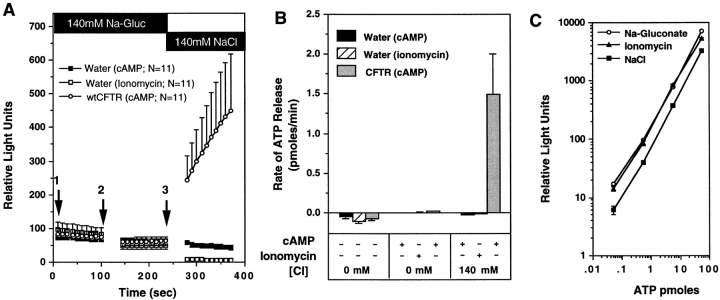 Figure 2. Absence of ATP efflux after activation of Ca+-activated Cl− conductance in oocytes. To assess whether membrane potential changes due to opening of Cl− channels in oocytes could nonspecifically facilitate ATP efflux, the rates of ATP efflux in cAMP/forskolin stimulated CFTR cRNA- injected oocytes, and ionomycin-treated water-injected oocytes were compared. A demonstrates the mean (± SEM) relative light units produced from oocytes derived from two frogs after exposure to the following sequence of buffers: (1) 140 mM Na-gluconate/HPBR; (2) 140 mM Na-gluconate/HPBR + (200 μM 8-cpt-cAMP, 2.5 μM forskolin, or 10 μM ionomycin); and (3) 140 mM NaCl/HPBR + (200 μM 8-cpt-cAMP, 2.5 μM forskolin, or 10 μM ionomycin). Buffer changes are denoted by arrows, and the treatment conditions are indicated in the legend. B depicts the mean (± SEM) rate of ATP efflux for each buffer condition as calculated from the slope of relative light units vs. time (for the 100-s reading) for each individual oocyte. ATP concentration curve standards were used to calibrate rates in terms of pmoles/min (1 pmole ATP = 90 light units). All oocytes analyzed were included in these results. To demonstrate that ionomycin has no effect on the activity of luciferin–luciferase, we compared standard curves for ATP in the presence of buffers and agonists used for the above study (C). Ionomycin standard curves were measured in Na-gluconate buffers.