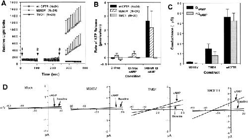Figure 3. Comparison of CFTR-modulated ATP release between wild-type, TMD1, and Δ259-M265V CFTR cRNA– injected Xenopus oocytes. Results in A demonstrate the mean (± SEM) relative light units produced by CFTR cRNA–injected oocytes exposed to the following order of buffers: (1) 140 mM Na-gluconate/HPBR; (2) 140 mM Na-gluconate/HPBR, 200 μM 8-cpt-cAMP, 2.5 μM forskolin; and (3) 140 mM NaCl/HPBR, 200 μM 8-cpt-cAMP, 2.5 μM forskolin. Buffer changes are denoted by arrows, and cRNA injected is indicated in the legend. B depicts the mean (± SEM) rate of ATP efflux for each buffer condition as calculated from the slope of relative light units vs. time (for the 100-s reading) for each individual oocyte. C depicts the mean (± SEM) Wc chloride conductance values representing the total and delta conductance after adding forskolin/IBMX to the bathing solution (corrected for water-injected background). D gives the mean I/V relationships for each construct in the presence and absence of the cAMP agonists forskolin/IBMX. An equal number (N) of wt CFTR, TMD1, and Δ259-M265V cRNA-injected oocytes were assessed for ATP efflux within each of two batches of oocytes. All oocytes analyzed were included in these results derived from two independent frogs.