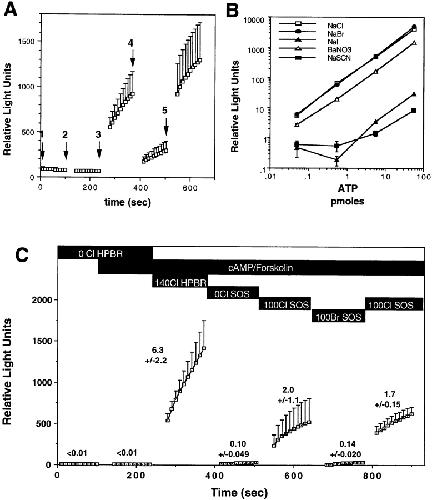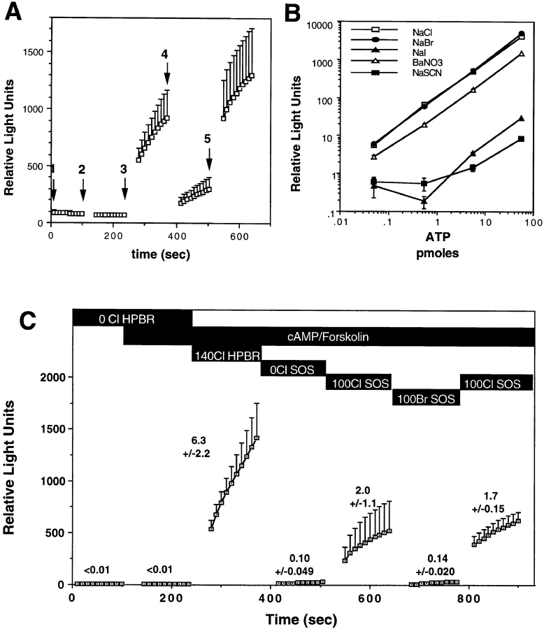 Figure 4. CFTR-modulated ATP release is influenced by extracellular halides. A depicts the mean (± SEM) relative light units produced by CFTR cRNA-injected oocytes (N = 25) from five frogs. Oocytes were exposed to the following order of buffers: (1) 140 mM Na-gluconate/HPBR; (2) 140 mM Na-gluconate/HPBR, 200 μM 8-cpt-cAMP, 2.5 μM forskolin; (3) 140 mM NaCl/HPBR, 200 μM 8-cpt-cAMP, 2.5 μM forskolin; (4) 140 mM NaBr/HPBR, 200 μM 8-cpt-cAMP, 2.5 μM forskolin; and (5) 140 mM NaCl/HPBR, 200 μM 8-cpt-cAMP, 2.5 μM forskolin. Buffer changes are denoted by arrows. Only oocytes that demonstrated release in the presence of extracellular Cl− (arrow 3) were pooled for this analysis. The mean (± SEM) rates of ATP efflux calculated from the rates for each individual oocyte were 3.3 ± 1.5 pmoles ATP/min (buffer 3), 1.0 ± 0.5 pmoles ATP/min (buffer 4), and 4.0 ± 1.7 pmoles ATP/min (buffer 5). B depicts the affects of various halides and anions on the activity of luciferin–luciferase using standard curves for ATP (no differences were seen in Cl and Br-containing buffers). The halide selectivity of CFTR-modulated ATP release in SOS and HPBR was compared in C. These studies evaluated ATP efflux in wtCFTR cRNA-injected oocytes using the specified order of buffers as shown in the figure (details of buffer composition are described in Materials and Methods). Results depict the mean (± SEM, N = 6) relative light units produced in each buffer with mean (± SEM) rates of ATP efflux shown above each line. Calculated rates of ATP efflux are the mean of rates from individual oocytes in pmoles ATP/min. In this analysis, oocytes that demonstrated no ATP efflux under all of the buffer conditions were not included in these calculations that attempted to compare Cl to Br dependence of ATP release.