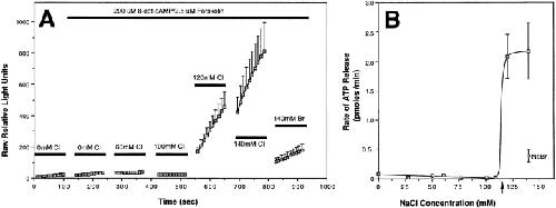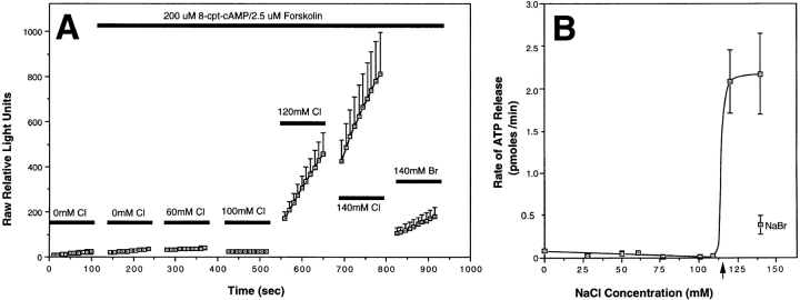 Figure 5. Extracellular Cl− concentration determines the relative activity of CFTR-modulated ATP release. Two independent batches of wtCFTR cRNA- injected Xenopus oocytes were analyzed for the effects of extracellular Cl− concentration on the activation of ATP efflux. An HPBR solution was used throughout these experiments with alterations in the final NaCl concentration facilitated by exchange of an equal molar amount of Na-gluconate with NaCl. The total concentration of NaCl and Na-gluconate was equal to 140 mM throughout these experiments with a constant osmolarity. A demonstrates the mean (± SEM) relative light units produced by CFTR-expressing oocytes for which the extracellular Cl− concentration was incrementally increased by adding NaCl-containing buffers with a constant concentration of luciferin–luciferase enzymes. Between seven and eleven oocytes were evaluated at each Cl− concentration from two independent frogs. At the end of the experiment, Cl− was replaced with Br− to confirm the halide selectivity of the oocytes analyzed. Oocytes that did not demonstrate ATP efflux above water-injected controls (data not shown) were not included in this data set. B depicts the mean (± SEM) rates of ATP efflux from cumulative data of four independent batches of CFTR cRNA-injected oocytes as a function of Cl− concentration. The rate of ATP efflux in the presence of extracellular Br− is also included for reference. The concentration of extracellular Cl− necessary for activation of CFTR-modulated ATP efflux was ∼115 mM (arrow).