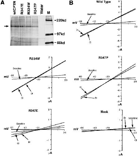 Figure 6. Electrophysiological properties of CFTR mutants using Wc two-electrode voltage clamp measurements. Mutants of CFTR that alter charged arginine residues within the channel pore including R334W, R347E, and R347P were used. A demonstrates the amount of [35S]methionine-labeled CFTR immunoprecipitated with anti-hCFTR antibodies from oocytes injected with mutant and wild-type CFTR cRNAs. The arrow depicts unglycosylated CFTR protein produced 3 h after injection. The Wc I/V relationships for wtCFTR, R347P, R347E, R334W cRNA, and water-injected oocytes are given in B. Arrows denote the I/V relations before forskolin/IBMX activation in the presence of extracellular Cl− (marked baseline) and after adding forskolin/ IBMX in the presence of extracellular Cl− (Cl) and bromide (Br). Stimulation of CFTR was performed by perfusion of the oocyte with appropriate buffers containing 100 μM IBMX and 10 μM forskolin. ND96 buffer was used throughout the experiment where NaBr replaced NaCl for halide selectivity measurements. The order of buffer perfusion was as follows: (a) ND96 (NaCl); (b) ND96 (NaCl) + forskolin/IBMX; and (c) ND96 (NaBr) + forskolin/IBMX. These results depict average I/V relationships from N experiments for wtCFTR (N = 5), R347E (N = 5), R347P (N = 5), R334W (N = 8), and water (N = 7)-injected oocytes from at least two independent batches of oocytes.