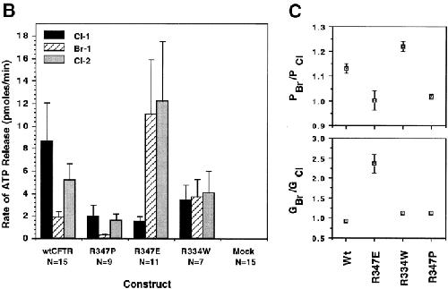 Figure 7. Halide dependence of CFTR-modulated ATP release is mediated by a chloride sensor within the channel pore. Results in A demonstrate the mean (± SEM) relative light units produced after activation with 8-cpt-cAMP/forskolin and changes in the extracellular halide concentration. The number of oocytes (N) compiled for each mutant are given with the number of independent experiments for wtCFTR = 3, R347P = 2, R334E = 3, R334W = 2, and water = 3. Although all mutants were not always evaluated at one time, CFTR and water-injected controls were always performed alongside of mutants to confirm the integrity of ATP responses in the particular batch of oocytes. B depicts the mean (± SEM) rate of ATP efflux during the last three buffer conditions as calculated from the slope of relative light units vs. time (for the 100-s reading) for each individual oocyte. The halide selectivity of CFTR-modulated ATP release is compared with the halide permeability (PBr/PCl) and conductance (GBr/GCl) ratios for each of the mutants in C. Results depict the mean (± SEM) for each construct as determined from the individual I/V curves (the number of oocytes analyzed are shown in Table II).