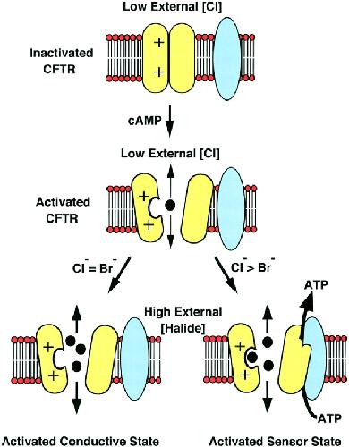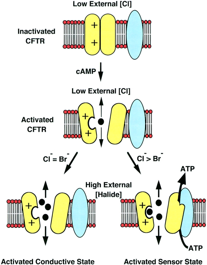 Figure 8. Chloride sensor model for CFTR activation of ATP release. The proposed mechanism for CFTR-modulated ATP release in Xenopus oocytes must fit several criteria. First, extracellular Cl− and cAMP agonist stimulation are necessary but not sufficient to activate CFTR-modulated ATP release. Second, the fact that not all batches of oocytes that demonstrated CFTR-modulated Cl− conductance were capable of ATP efflux, suggests that a cofactor(s) (blue) is needed for CFTR-modulated ATP release (CFTR is yellow). The dependency of CFTR-modulated ATP release on the external Cl− concentration and the effects of mutagenesis of putative pore residues in CFTR suggest that Cl− may bind within the channel pore to activate structural changes in CFTR necessary for the appropriate interactions with a cofactor(s)- dependent ATP release pathway. This model also incorporates the altered halide selectivity of CFTR mediated conductance (Cl = Br) and ATP efflux (Cl > Br) as dependent on the affinity for halide binding at the chloride sensor within the channel pore.