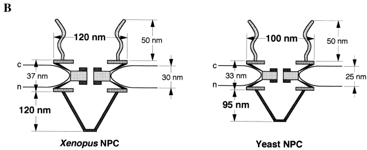 Figure 1. Yeast NPCs. (A) Cross section through the NE and a gallery of selected electron micrographs of NPC cross sections. Large arrowheads, nuclear baskets; small arrowheads, cytoplasmic fibrils; c, cytoplasm; n, nucleus. (B) Schematic comparison of Xenopus and yeast NPCs. Bar, 100 nm.