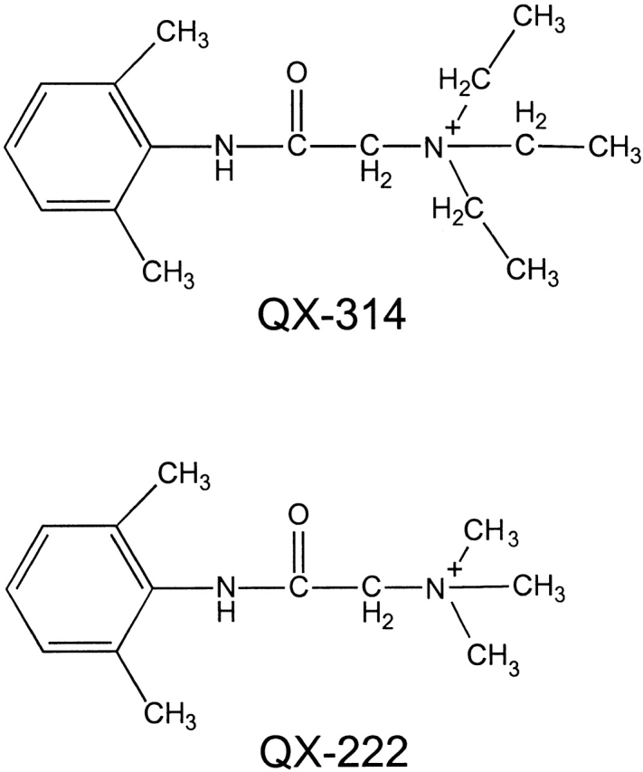 The triethylammonium QX-314 and the trimethylammonium QX-222 are lidocaine derivatives that act as open-channel blockers of the acetylcholine (ACh) receptor. When bound, these blockers should occlude some of the residues lining the channel. Eight residues in the second membrane-spanning segment (M2) of the mouse-muscle alpha subunit were mutated one at a time to cysteine and expressed together with wild-type beta, gamma, and delta subunits in Xenopus oocytes. The rate constant for the reaction of each substituted cysteine with 2-aminoethyl methanethiosulfonate (MTSEA) was determined from the time course of the irreversible effect of MTSEA on the ACh-induced current. The reactions were carried out in the presence and absence of ACh and in the presence and absence of QX-314 and QX-222. These blockers had no effect on the reactions in the absence of ACh. In the presence of ACh, both blockers retarded the reaction of extracellularly applied MTSEA with cysteine substituted for residues from alphaVal255, one third of the distance in from the extracellular end of M2, to alphaGlu241, flanking the intracellular end of M2, but not with cysteine substituted for alphaLeu258 or alphaGlu262, at the extracellular end of M2. The reactions of MTSEA with cysteines substituted for alphaLeu258 and alphaGlu262 were considerably faster in the presence of ACh than in its absence. That QX-314 and QX-222 did not protect alphaL258C and alphaE262C against reaction with MTSEA in the presence of ACh implies that protection of the other residues was due to occlusion of the channel and not to the promotion of a less reactive state from a remote site. Given the 12-A overall length of the blockers and the alpha-helical conformation of M2 in the open state, the binding site for both blockers extends from alphaVal255 down to alphaSer248.