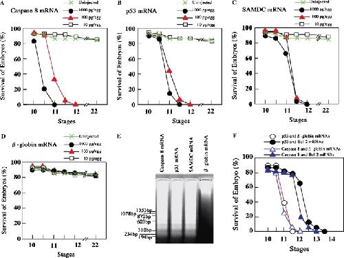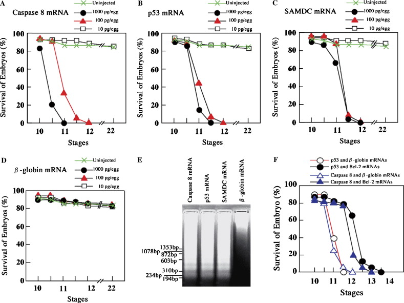 Appearance of embryos injected with various mRNAs. (A) Uninjected (mRNA was not injected, but only distilled water was injected; same for all the âuninjectedâ in the following figures). (B) Injected with SAMDC mRNA. (C) Injected with caspase-8 mRNA. (D) Injected with p53 mRNA. (E) Injected with SAMDC mRNA. (F) Injected with β-globin mRNA plus β-globin mRNA. mRNAs were injected at 1000 pg/egg (AâD) at 1-cell stage or injected into only one blastomere at 2 cell stage (E,F). Embryos were cultured in 1à Steinbergâs solution. (E) No cell dissociation took place. (F) Only dissociated cells carry blue color.