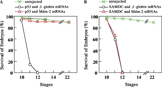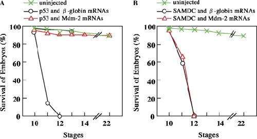 Effect of coinjection of Xdm-2 mRNA on the effect of the injection of p53 or SAMDC mRNA. Fertilized eggs were coinjected with 500 pg/egg of Xdm-2 mRNA (triangle) and 100 pg/egg of either p53 mRNA (A) or SAMDC mRNA (B). mRNA for β-globin (circle) was also coinjected into p53 or SAMDC mRNA as a control. Fifty embryos of the same batch were used for each experimental group. Experiments were repeated twice with similar results.