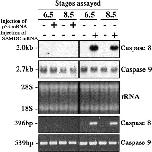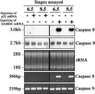 Northern blot and RT-PCR analyses for caspase-8 and -9 mRNAs in p53- or SAMDC-overexpressed embryos. Fertilized eggs were injected (+), or not (â) injected, with p53 or SAMDC mRNA (1000 pg/embryo) and cultured in 1Ã Steinbergâs solution throughout the experiment. RNAs were isolated from embryos at different stages. (Upper panel) RNAs were separated on a 1% agarose gel containing formaldehyde, transferred to a nylon membrane, and hybridized with 32P-labelled specific probes for Xenopus caspase-8 and -9. (Lower panel) RNAs were also subjected to RT-PCR as described in details under Materials and methods. The signal obtained for caspase-8 mRNA was 396 bp, and that for caspase-9 mRNA was 539 bp. 28S and 18S rRNAs were stained with ethidium bromide. Three independent experiments were done, with essentially the same results.
