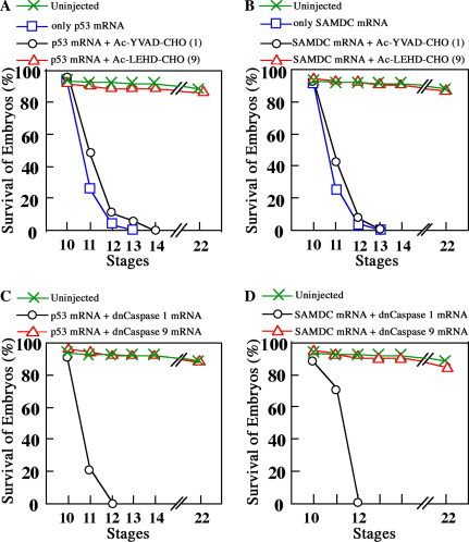 Effects of coinjection of peptide inhibitors for caspase-8 and caspase-1, and dominant-negative type mutants of caspase-8 and caspase-1 into p53 or SAMDC mRNA-injected embryos. Fertilized eggs were coinjected with 1000 pmol of peptide inhibitor for caspase-8 or caspase-1 together with mRNA for p53 (A) or SAMDC (B) both at 100 pg/egg. Fertilized eggs were coinjected with 1000 pg/egg of mRNA for dominant-negative type mutant of caspase-8 (dncaspase-8) or caspase-1 (dncaspase-1) together with mRNA for p53 (C) or SAMDC (D). Fifty embryos of the same batch were used for each group. Each set of experiments was repeated twice with similar results.