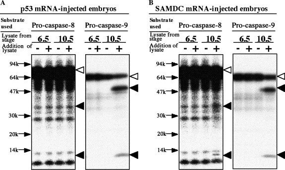 Appearance of the activity to cleave pro-caspases in p53- and SAMDC-overexpressed Xenopus apoptotic embryos. [35S]Methionine-labelled enzymatically defective pro-caspases were prepared and incubated with lysates prepared from embryos injected with mRNA (1000 pg/embryo) (+) for p53 or SAMDC. Lysates were also prepared from embryos injected with β-globin mRNA alone (1000 pg/embryo) (â) as control experiments. Reaction products were analyzed on SDSâPAGE under the reducing condition and autoradiographed. (A) p53-overexpressed embryos. (B) SAMDC-overexpressed embryos. Molecular size markers, locations of pro-caspase (open arrowheads), and cleaved products (closed arrowheads) are shown.