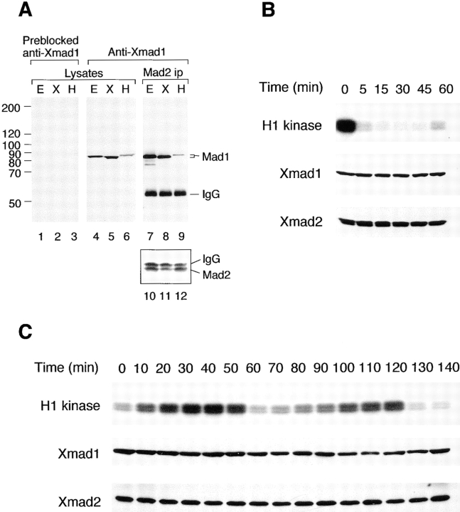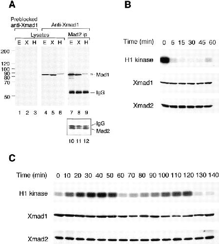Figure 6. Xmad1 abundance is constant throughout the cell cycle. (A) Specificity of anti-Xmad1 antibodies in immunoblots of frog egg extracts (lanes E), frog cultured cells XTC (lanes X), and HeLa cells (lanes H). An affinity-purified anti-Xmad1 antibody (lanes 4–9) or the same antibody preblocked with recombinant Xmad1 protein (lanes 1–3) were used. Lanes 1–6, egg extracts or cell lysates. Lanes 7–12, anti-Xmad2 immunoprecipitates prepared from egg extracts or cell lysates were immunoblotted with anti-Xmad1 (lanes 7–9) or anti-Xmad2 (lanes 10–12) antibodies. (B) CSF-arrested extract (time 0) was incubated with calcium for the time indicated on top, and immunoblotted for Xmad1 (middle) or Xmad2 (bottom). Top, histone H1 kinase assay. (C) Immunoblots of cycling extracts using antibodies specific to Xmad1 (middle) or Xmad2 (bottom). Mitosis occurs at ∼50 and 120 min as determined by histone H1 kinase assay (top) and by the nuclear morphology (data not shown).