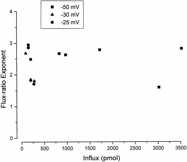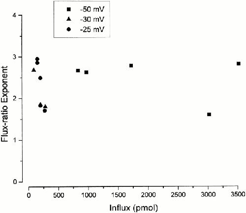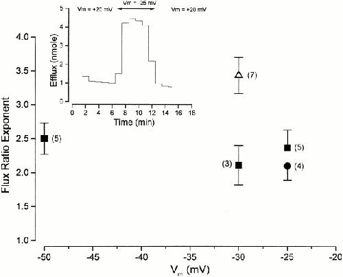 Figure 2. IRK1 channel flux-ratio exponent from influx experiments. Flux-ratio values at −50 (▪), −30 (▴), and −25 (•) mV as