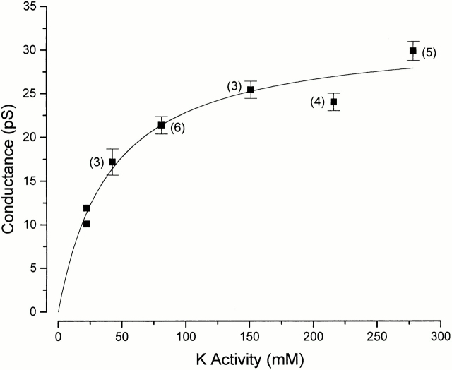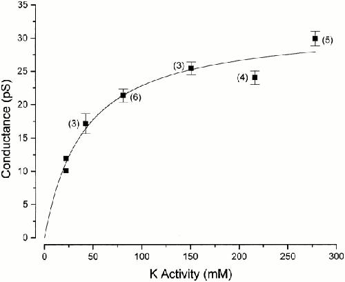 Figure 5. IRK1 single channel conductance as a function of symmetrical K+ activity. Mean single channel conductance level and