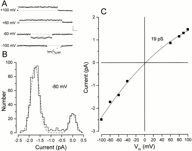 symmetrical 100 mM K+ solutions. The dotted line represents