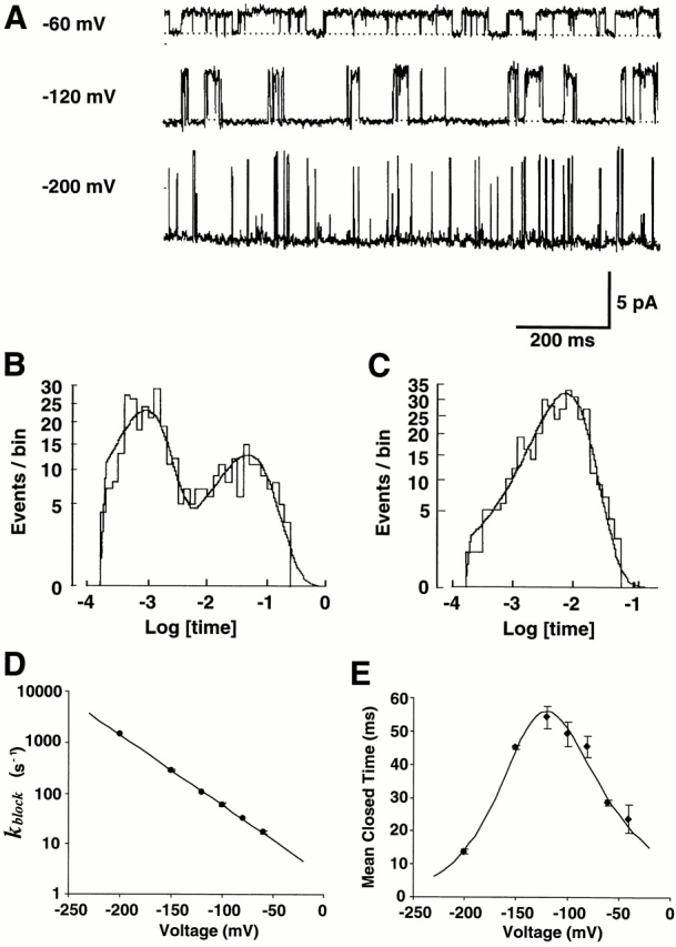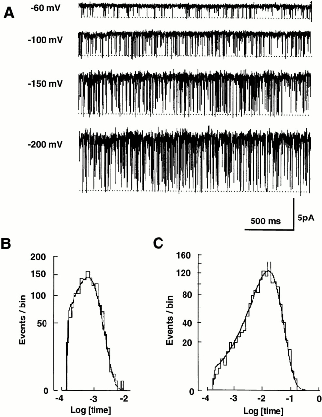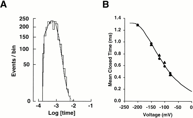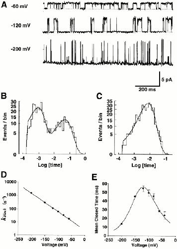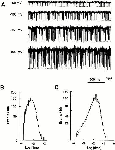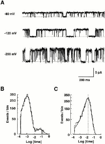 those at −80 and −200 mV. (B) Histogram of closed times at −100