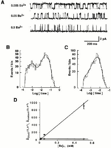 kblock = A · [Ba2+]o, where A is 1.94 · 106 s−1 M−1. kunblock was obtained from the inverse of long closed time. The line for the kunblock