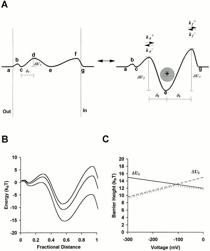 with Eq. 6 were ΔU2 = 13 kBT, δ2 = −0.10, ΔU3 = 16 kBT, and δ3 =