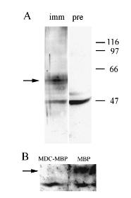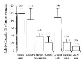 FIG. 2.Quantitation of the immunofluorescence labeling accom-plished by measuring the summed labeling intensity within thelabeled sperm as the amount of competing fusion protein wasvaried. The error bars are equal to the 95% confidence intervalsaround the mean;nis indicated in parentheses above each bar.Sperm from five males were used. The asterisk refers to a statisti-cally significant difference from the immune serum value (P,0.05, analysis of variance). These data suggest that the antibodies toxMDC16 recognize a protein on the surface of live, egg jelly-activated sperm and support the specificity of labeling by the rabbitimmune serum since the label intensity on the sperm is reducedwhen the serum is preexposed to the indicated amount of xMDC16fusion protein, but not with exposure to MBP alone.