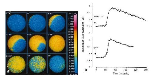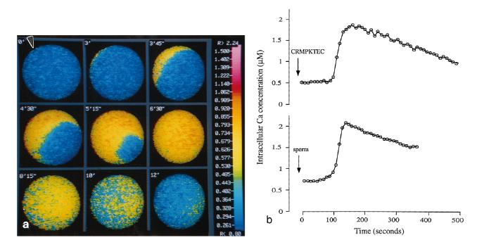FIG. 5.Peptide-induced changes in [Ca21]iin theXenopusegg. (a) Peptide-induced changes in [Ca21]iin a dejellied, albino egg injected withfura-2â dextran (50 â100mM final concentration) in Ca21-free F1 medium detected by ratio imaging. Response to soluble xMDC16 peptide(20 nmol) added from direction indicated (arrowhead). The fluorescence emitted was calibrated as described previously (Nuccitelliet al.,1993) and converted into a pseudocolor representation of the calcium concentration. Egg diameter, 1.2 mm. (b) Comparison of intracellularcalcium levels in dejellied albino eggs treated with xMDC16 (upper trace, no external Ca21) or sperm (lower trace, normal Ca21). Theinterval between data points is 10 s, and the time of sperm or peptide addition is indicated. Intracellular free calcium in eggs is elevatedin response to xMDC16 peptide in a manner identical to that at fertilization.