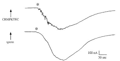 FIG. 6.Two-electrode voltage clamp study of peptide-induced egg activation. Activation current across the plasma membrane in eggs clampedat220 mV. The traces were copied from a chart recording and correspond to the current passed to keep the voltage constant. The times ofaddition of peptide or sperm are indicated with an arrow. (Upper trace) Egg clamped at220 mV and treated with 20 nmol of xMDC16 (1mlof20 mM stock). (Lower trace) An egg clamped at220 mV and treated with sperm. Asterisk (*) indicates initial rapid inward current.