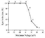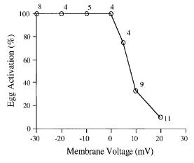 FIG. 7.Percentage of egg activation by xMDC16 disintegrinpeptide in eggs voltage clamped at different membrane potentials.The number of eggs per data point is indicated. Activation wasscored by the elicitation of an activation current, vitelline envelopeelevation, and cortical contraction. Peptide-induced egg activationincludes an inward activation current similar to that observed atfertilization and the ability of the peptide to activate is dependenton the voltage across the eggâs plasma membrane